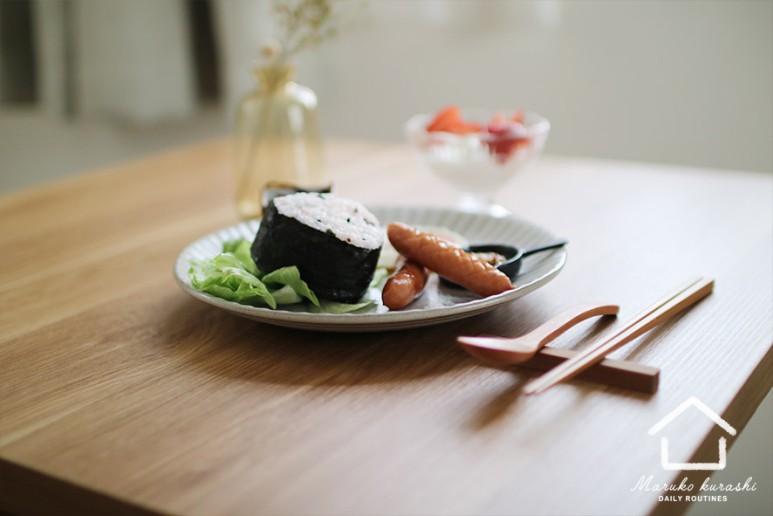 우메보시 후리카케 섞은 밥으로 오니기리를 만들었어요.