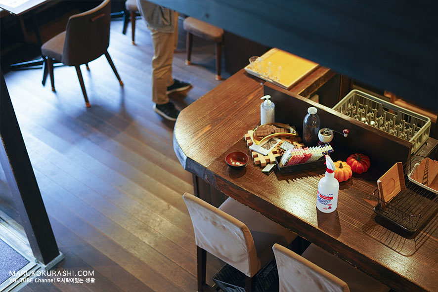 이젠 제균 티슈없인 밖에 나가기 힘들어져버린 세상. 테이블에 부착된 가방걸이에 걸린 저의 가방 사이로, 외출용 제균티슈가 살짝 보입니다. 사실 티슈 이외에도 작은 스프레이통에 집에서 쓰는 액상 타입의 소독액을 담아서 별도로 가지고 다니고있어요. 마트, 책방 그어딘가에 다녀오고나면 밖을 나서서 절대적으로 취하는 행동은 티슈로 손을 닦은 뒤에, 다시한번 스프레이로 손을 소독하는 작업입니다.