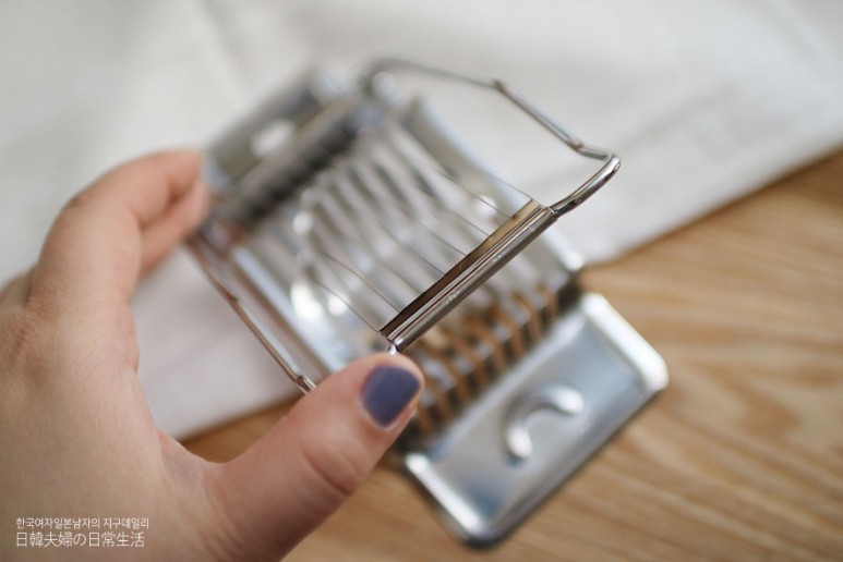 물에 잘 삶은 달걀을 껍질을 벗겨, 컷팅기를 벌렸을때 나오는 가로로 움푹 파인곳에 계란을 그대로 넣어주고 잘 고정해서 컷팅기를 닫아내면