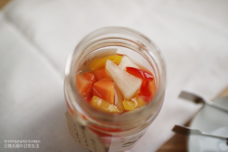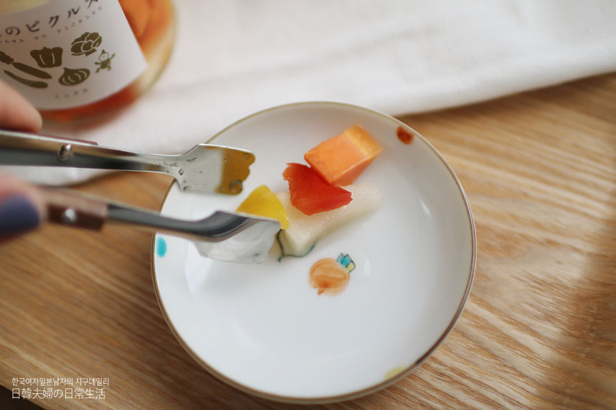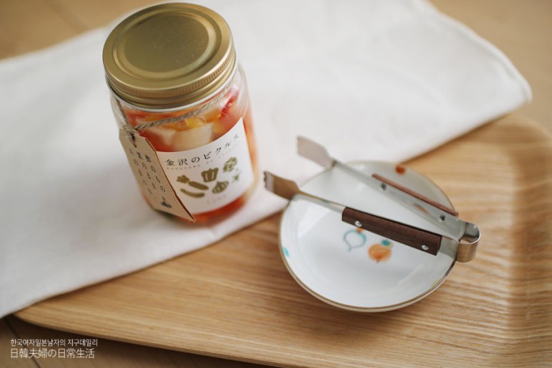 다양한 야채가 들어있고, 새초롬한 맛이 참 매력적인 피클을, 과거에는 정말 피자집에서만 먹던 초록 피클만을 먹거나 떠올렸던 것 같은데, 얼마전 남편과 갔던 마트에서 구매한 "가나자와피클"은 정말 맛있어요.