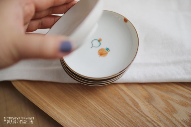 참 간단한 그림인 것 같은데도, 이 작은 접시의 브라운 테두리와도 왜그리 잘 어울리며, 반찬들을 담을때에 되도록이면 패턴이 없는 접시를 선호하고는 하는데, 적절히 반찬의 색감이나 종류에 방해받지 않는듯한 진짜 너무 사길 잘했다. 라는 접시들이예요.