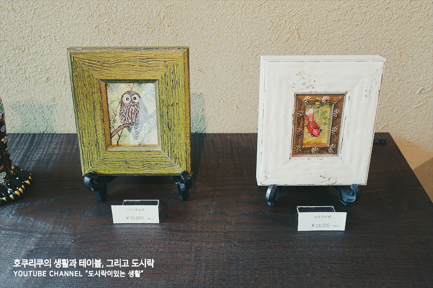 선반 선반마다 작가의 세계관까지 엿볼 수 있는 것 같아요. 저명한 작가에서 떠오르는 젊은 작가들까지, 그리고 재밌는건 부자지간의 작가 가족도 있더라구요. 창작은 대를 잇는 듯 하면서도 아버지와는 또다른 작품의 스타일. 가격은 작품에 따라 다르지만 1만엔대로 구입할 수 있는 것도 있으므로 기본적으로 공간을 만끽하는 관람을 추천드립니다. 전 붕어가 그려진 작은 액자가 너무너무 갖고 싶었지만 그저 마음속에 품어두었습니다. 금액대는 8천엔대 후반, 세금 포함하면 1만엔정도될 것 같았어요.
