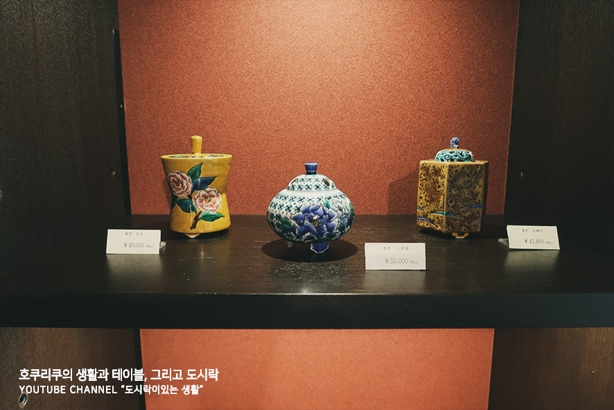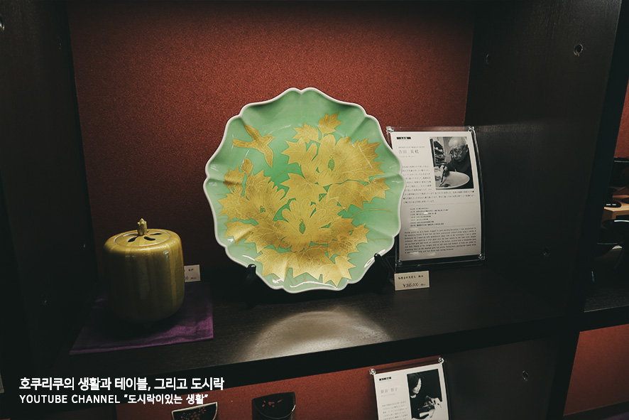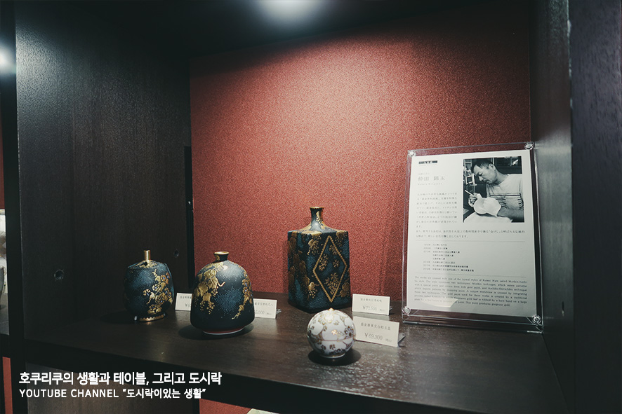 작가들의 이력과 함께 진열된 대표 작품들은 쇼케이스에 넣어 보관하지 않고 오픈하는 형식으로 좀더 가깝고 선명하게 훌륭한 작품들을 볼 수 있는것이 이곳의 매력인 것 같아요. 대부분 가나자와에서 유명한 칠기 공예(쿠다니야끼) 품들이었는데요, 무형문화재 보유자 및 (인간문화재) 문화 훈장 수상들, 전통 공예사를 비롯한 엄선된 작가들의 작품을 전시하고 그것을 이렇게 좋은 기회로 경험할 수 있으니 공예에 애정이 있는 저로써는 또하나의 뜻깊은 공간이 아닐 수 없었어요.