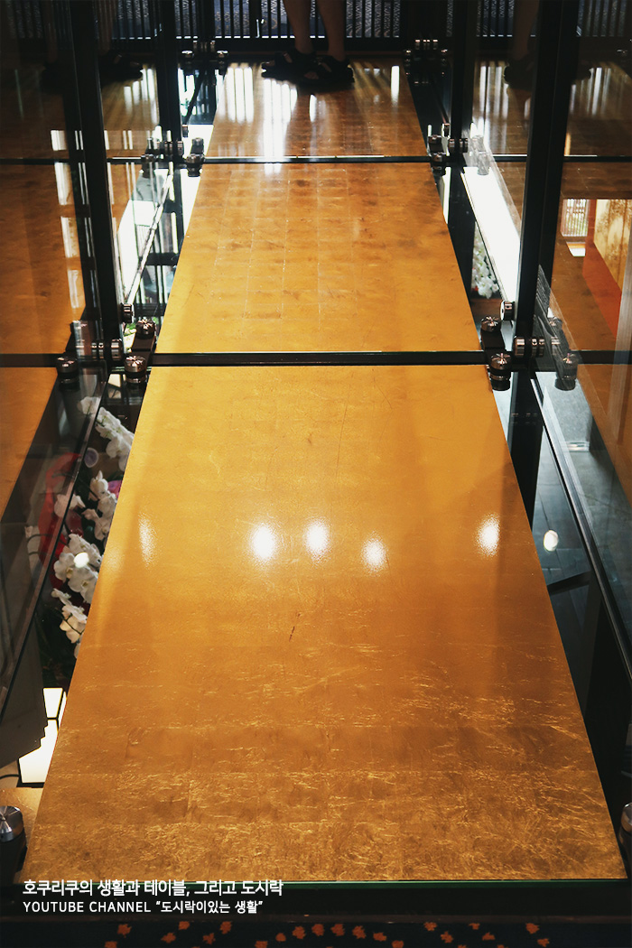 그 창가를 마주보는곳을 직원분이 잠시 안내해주셨는데요. 바닥이 금으로된 투명한 다리였어요. 바닥이라고 하는것이 맞는 것 같습니다. 중앙에 깔린 양탄자처럼 보이는 전부다 금이였어요. 그리고 사이드로 내려다보이는 아래층의 현황. 조금 아찔했지만 금 위를 걷고있다는 기분으로 즐겨보라는 직원분의 말에 그냥 지나치려던 공간을 왕복은 해본 것 같습니다.