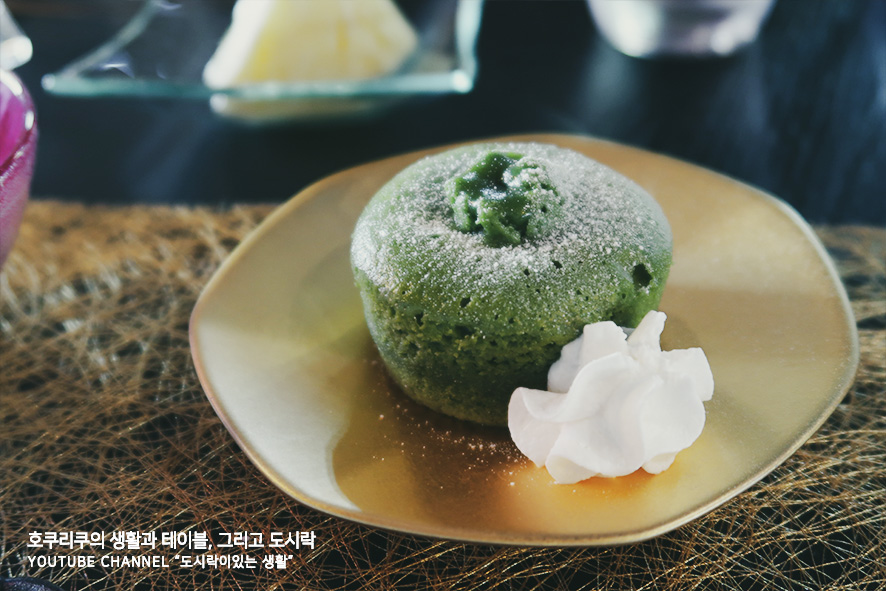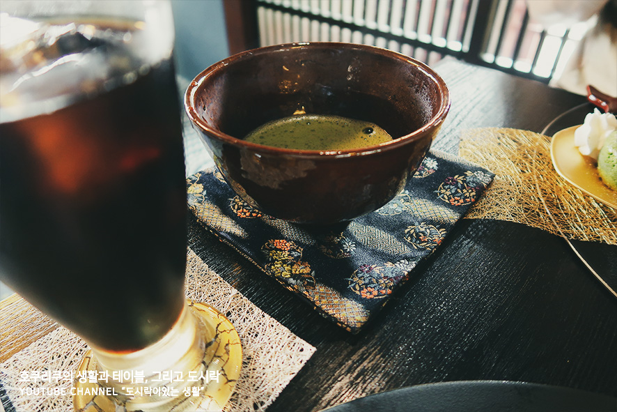 남편이 주문한 말차. 예전에 이시카와현 온천에 갔을때에 오전에 찻집에서 차를 마실수 있었는데 그곳에서 파는 말차 잔의 금액이 정말 하늘과 땅차이였던 것 같아서 참 놀랐던 기억이있어요. 이렇게까지 금액이 나갈수가 있구나 하며 말이예요. 사용된 어두운 원단으로 만든 코스터도 테이블 위에서 오묘한 느낌을 전달해주네요.