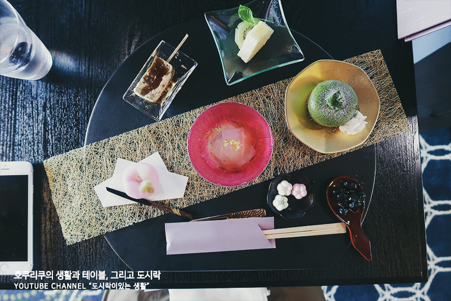 오늘은 정말 특별한것을 주문해보자! 하는 생각에서 금액은 좀 나가지만 데일리 사치를 부려보기로 남편과 마음먹었죠. 1인에 2천엔, 우리나라돈으로 2만원이 좀 넘는 금액의 가나자와스러운, 가나자와 다운 화려한 화과자 세트를 주문해보았습니다. 음료를 포함 일곱여가지의 가나자와 화과자의 집합 모음이었어요. 이곳에서 제공되는 과자들은 가나자와 전통 과자점의 과자라고하는데요, 계절마다 메뉴가 바뀌는 매력이있다고합니다. 메뉴의 이름은 가나자와 츠즈미,(金澤つづみ)