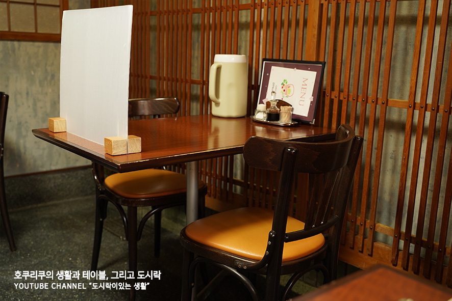 저희 부부의 일본 GW는 남들이 GW를 즐기고 모두 일상으로 돌아갈때즈음 시작되었기때문에, 평일 오전의 그릴 오츠카는 긴 - 손님들의 행렬은 온데간데 볼 수 없었고, 조용하고 편안한 분위기였던 것 같아요. 사실 들어가기 전까지만해도 TV에 잠깐 나왔던 모습을 기억하고 있을때에, 카운터 석만 촬영되었기때문에 엄청 좁은 가게인줄 알았는데요, 굉장히 넓고, 또 3개정도의 방 안에 각각 테이블들도 가득 , 또 혼자 먹으러 온 사람들은 카운터석에서 음식 만드는 소리를 감상하며 식사각 가능할 것 같았어요. 꽤 내부가 넓었습니다.