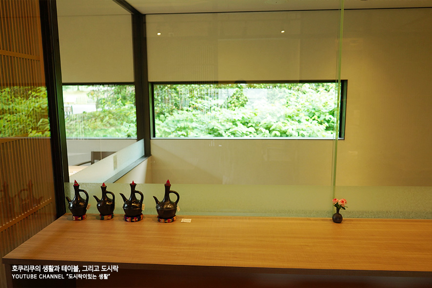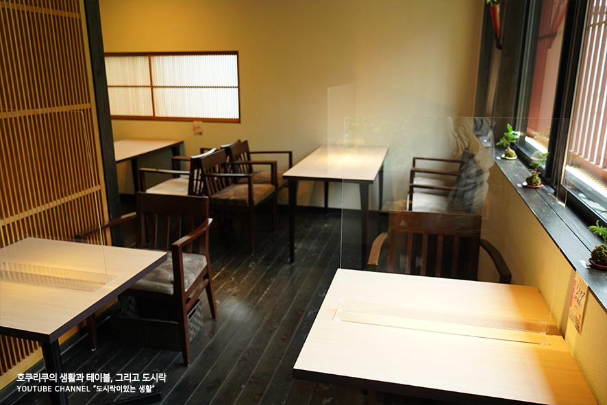 코로나 시국이라 그런지, 테이블에는 대부분 중앙 칸막이가 설치되어있었어요. 때문에 남편과도 중앙 칸막이 넘어 서로를 바라보며 살짝 은행 창구 업무 리액션까지 해봤답니다.  1층에서 2층으로 올라오면 바로 작은 룸과같은 공간 좌석이있는데요, 2층 난간의 공간과 정면의 역시나 개방감 넘치는 창을 바라보는 카운터석의 좌석도 다음에 앉아보고 싶더라구요.