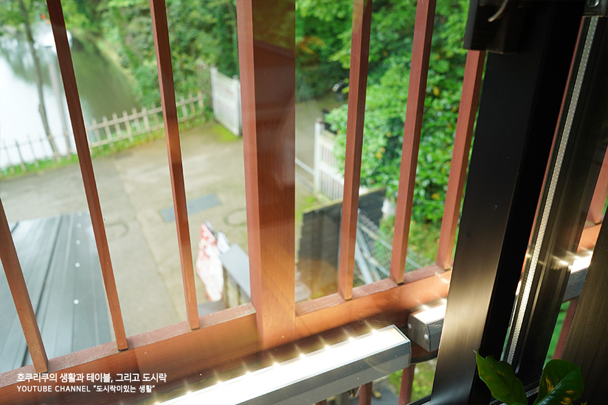 때마침 1층의 1인 고객을 제외하고는 우리뿐이었던 2층 모습입니다. 남편의 뒤로 보이는 넓직하게 시야가 뚫린 직사각형 창이 저는 개인적으로 너무너무 마음에 들었어요. 만약 이 고민가가 우리 집이었다면 2층인 이곳의 위치는 아무래도 침실이 좋지 않을까. 라는 생각까지 해가면서 아침햇살에 푸른 숲안에서 눈을 뜨는 그런 상상마져 아주아주 잠깐 해보았습니다(웃음)