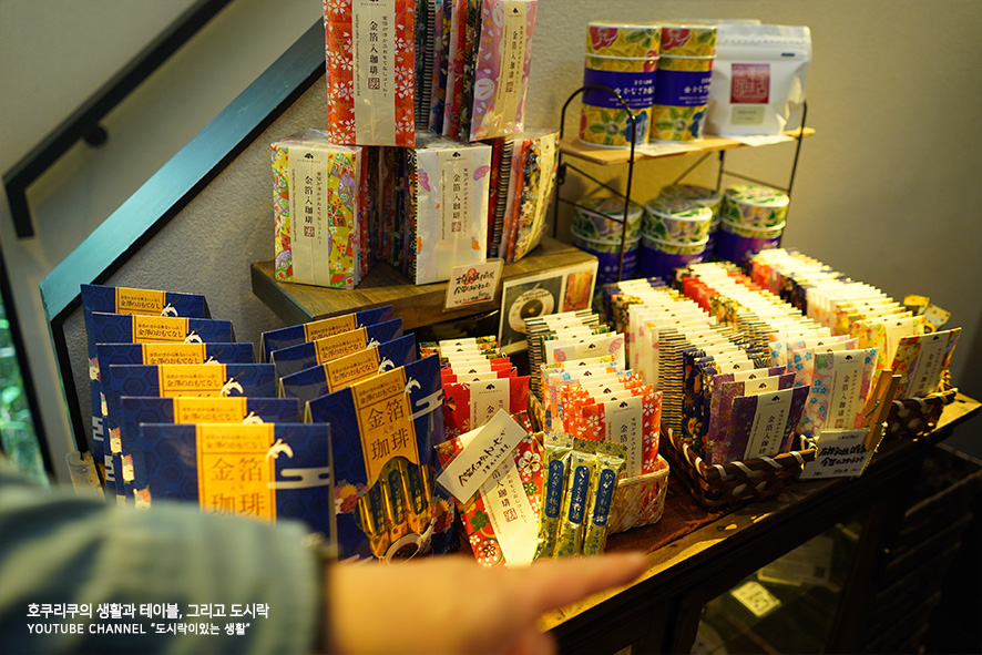 계산하며 내려올때 눈여겨두었던 가지각색 패턴의 패키지가 매력적으로 보이던 인스턴트 커피를 하나 추가 구매했어요. 사실 카라반 사라이 매장 내부에 가시면 여러가지 테마별, 계절별, 시즌별 패키지들만 봐도 구매욕구가 뿜뿜 터집니다. 선물용으로도 딱이고 커피 관련된 굿즈와 전문 생활용품 들도 구매하실 수 있기때문이예요. 이곳 가나자와커피야는 가나자와에서 많이 접하실 수 있는 쿠다니야키의 커피잔 세트또한 판매하고 있습니다. 그야말로 가나자와로인한 가나자와를 위한 가나자와의 정취와 공예를 접목시킨 제품 패키지는 기본적으로 점수를 먹고 들어간다고 생각하고있어요. 가나자와를 방문하시면 또 이곳을 방문하시면 빈손으로 돌아가진 못하실거예요.