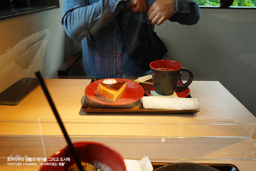 귀여운 새소리가 들리는 창밖을 바라보며 케이크 한입을 베어물고, 또 음료를 한모금 마시고, 대화가 흐르지 않아도 편안하고 부담없는 정적. 바로 보이는 가나자와성 쿠로몬 입구와 시야의 대부분을 차지하던 푸른 잎들의 계절감각덕분에 커피는 더더욱 맛있게 느껴집니다.