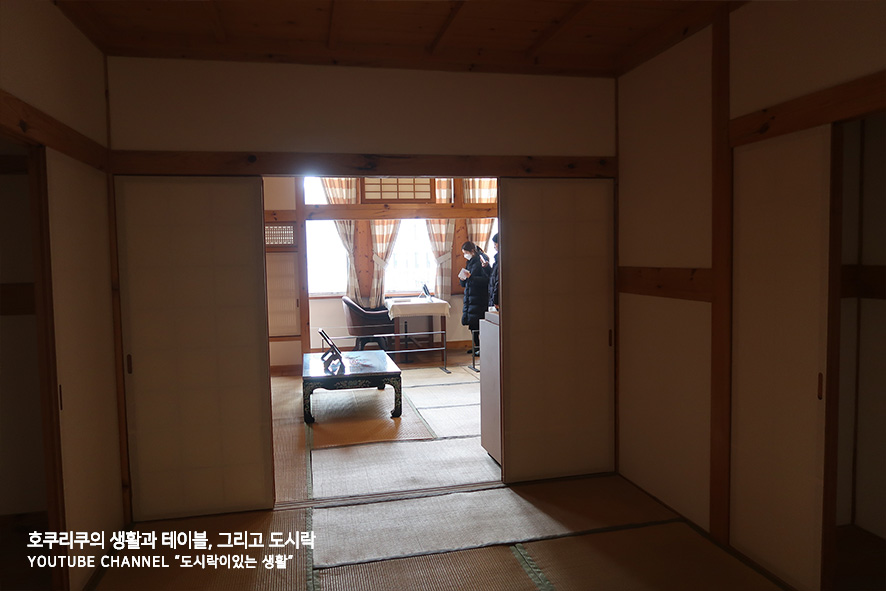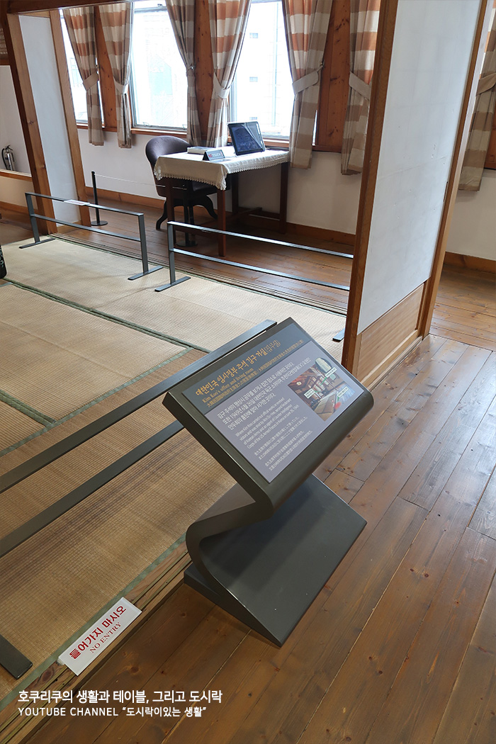 김구 선생님의 서재로 진입 하기 전, 큼지막한 다다미방이 보입니다. 1945년 11월 23일 대한민국 임시정부 요인과 수행원들이 환국하여 머문 곳으로써, 2층으로 올라와 가장 안쪽인 김구 선생님의 침실쪽으로 들어가는 방향에 보이는 다다미 공간. 일본식 장마루 복도 이외에는 이렇게 숙소쪽 역시 다다미 방으로 이루어져있습니다. 일본식 목조 가옥이 느껴지네요.