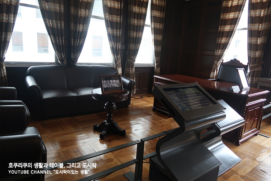선전부 사무실에서는 정부의 이념과 정책을 국내외에 홍보하는 업무를 수행했던 곳인데요, 벨벳의 고전적인 색감과 패턴의 소파가 굉장히 인상적입니다. 그당시의 그 때의 모습을 정말 잘 살려둔 모습이라고 생각합니다.