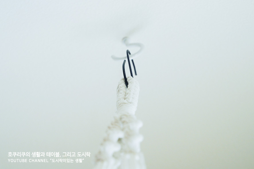 행잉플렌트 3개입 세트에 들어있던 뻑뻑한 고무 재질의 화이트톤 고리나사. 원형 지름 간격이 3센티정도 남칫 되는 시원시원한 사이즈의 고리형이라 부담없이 무언가를 걸기가 좋았던 것 같아요. 여기서 한가지 팁은 얇은 S자 고리를 한번 더 사용해 연결하는것입니다. 두께가 굵은 행잉플렌트 원단을 그대로 걸어버리거나 하면 힘이 가해지거나 방향이 틀어졌을때 가해지는 힘이 더 많이 전달 될 수 있기때문인데요.