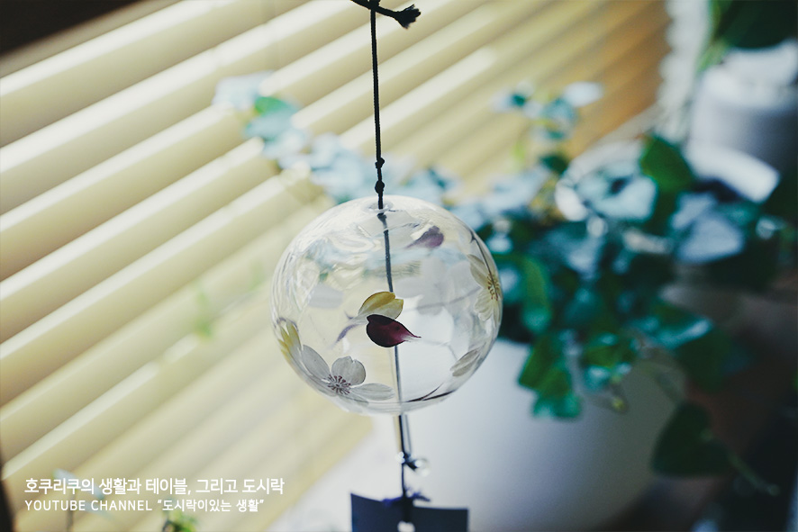 창가쪽에 늘어나는 그린식물들. 요녀석들 어떻게하면 잘 수납할수 있을까 하다가 높이 시원시원하게 뚫린 사이즈로 계산해 2단짜리 1미터 수납장을 만들어냈어요. 한동안 잠자고 있던 후우링도 한편에 걸어두어 아침에 창을 열어두면 띠링띠링 기분 좋은 소리를 냅니다.