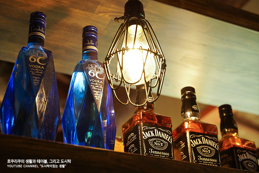 역시 바를 운영하는 곳이니 여기저기 다양한 술이 상단 선반에 진열되어있습니다. 매장의 메인은 정원이 보이는 디귿자 카운터석 Bar형태였어요. 2인식 앉으면 레지부분을 제외하고는 8명에서 9명까지도 앉을 수 있을 것 같았습니다. 다른 테이블 석은 아마도 4인석 2개, 그리고 2인석 2개정도였던 것 같아요. 내부는 그다지 밝거나 하지 않았지만, 한쪽 면이 대부분 창으로 되어있어 정원으로 바로 연결되었기때문에