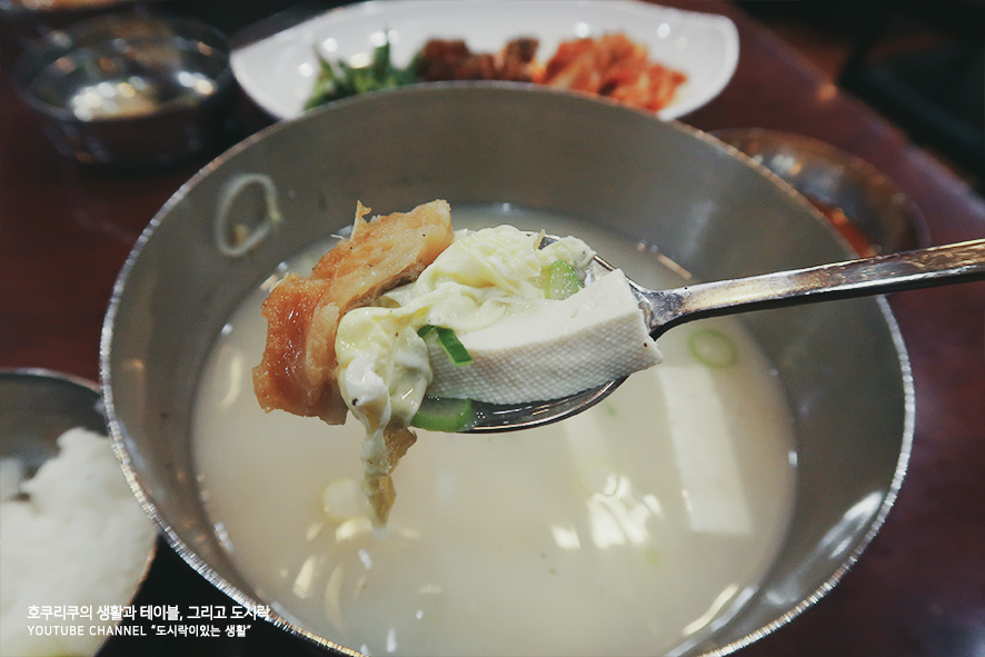 길게 썰린 두부, 북어살, 대파슬라이스, 계란, 간도 딱 좋아서 따로 소금 안넣어도 될 정도예요. 사골육수로 만들었는데, 조금 무거울수도있다는 생각은 버리시는것이 좋아요. 담백하고 가벼운데 정말 맛있는 국물입니다.