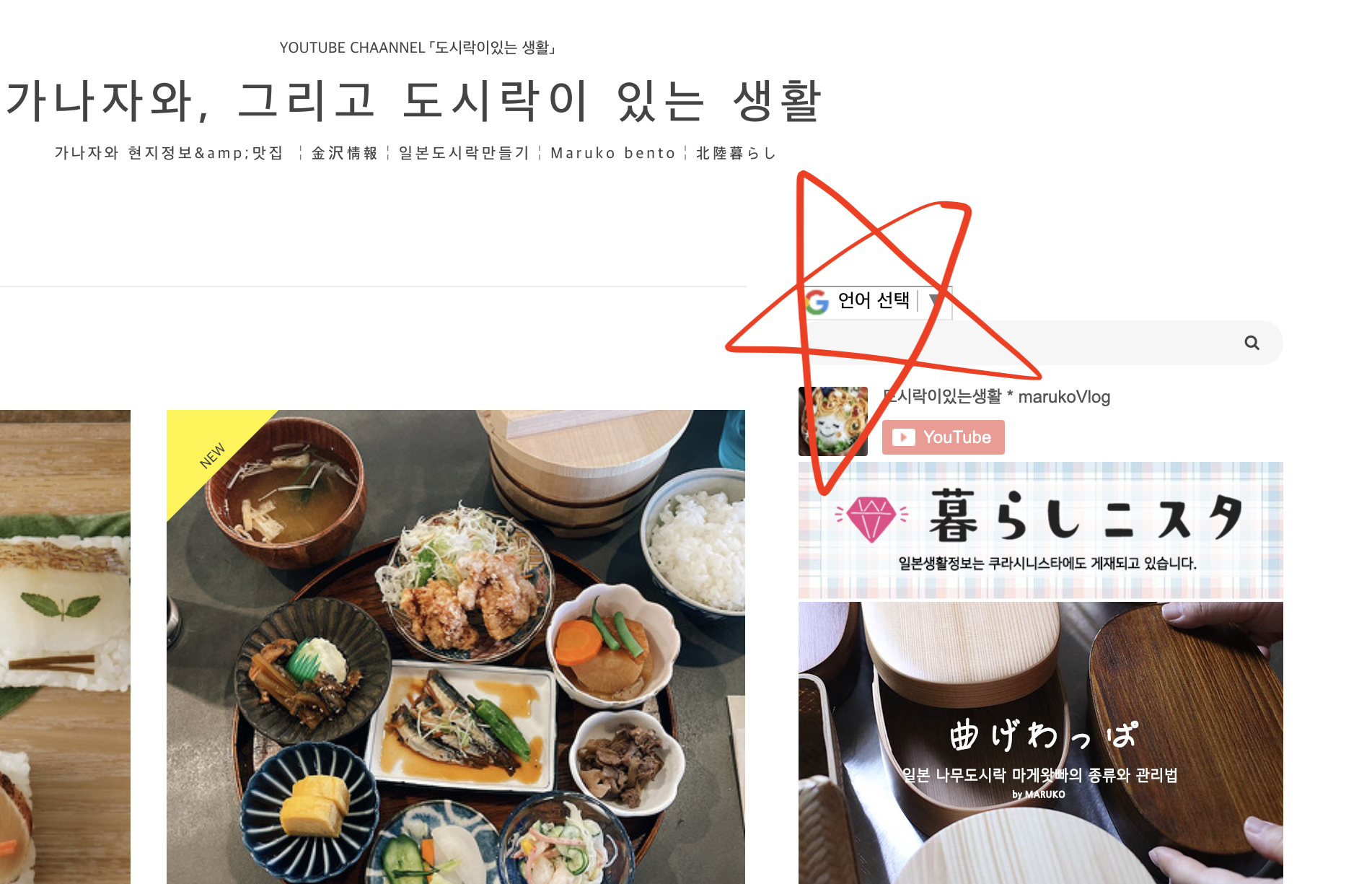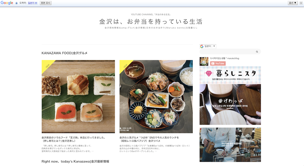 가장 많이 사용하는 영어와 일본어로 페이지를 변경해 캡쳐해봤는데요. 타이틀도 그렇고 번역이 잘못된 부분을 상당히 많이 발견할 수 있었던 단점(?)도 있지만 (일본어로는 "가나자와는 도시락을 가지고 있는 생활"로 해석되버렸네요/웃음/) 번역이 잘되도록 한국어를 좀더 간결하게 기재해서 수정해볼까합니다. 왼쪽은 영어로 번역된 페이지, 오른쪽은 일본어로 번역된 페이지예요. 페이지에 접속한 외국인이 잘 모르는 언어들로 가득한 페이지에 접속한것을 자신이 느낄때에 사진만 눈에 들어와 대충 훓게되는 상황과, 오류가 좀 있더라도 구글 번역 버튼을 인식하고 자국의 언어를 선택해 조금이라도 더 친근함을 느낄수있도록 블로그 자체 내에서 준비하는 것은 2021년이라는 시대에, 그리고 앞으로도 꼭 중요한 기능이 아닐까 라는 생각이 들기도합니다.