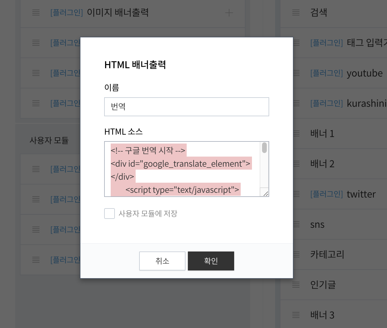 이렇게 편집 버튼이 나타나면 HTML소스라고 써있는 아랫부분 틀에 아까 카피해둔 구글번역 소스를 붙여넣기하신 뒤, 해당 플러그인 이름을 설정/기재 하시고 확인을 누르시면됩니다. (사용자 모듈에 저장 클릭은 절대적 필수사항은 아니예요/저는 체크하고 있어요)