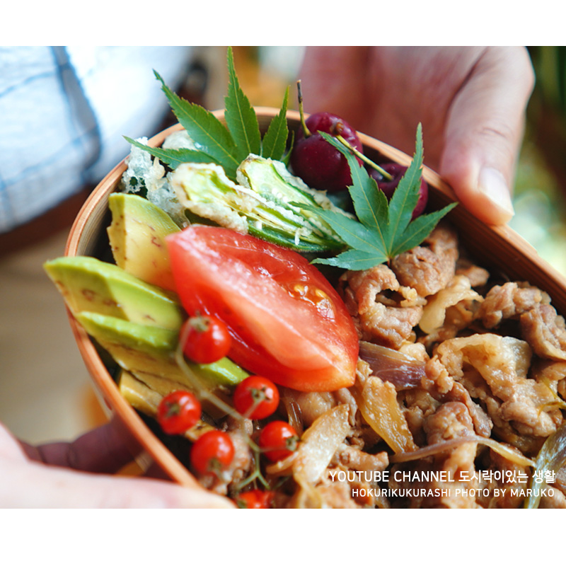 초록 빛깔의 단풍 나무가 참 많은 가나자와. 가을이 되면 붉게 물들지만 지금의 계절은 무척이나 초록빛으로 반짝반짝 빛이 나고 있어요. 식재료 데코용 단풍잎을 얹어 남편의 한끼 식사를 소풍 도시락으로 분위기 내 보았어요. ⠀⠀⠀⠀⠀⠀