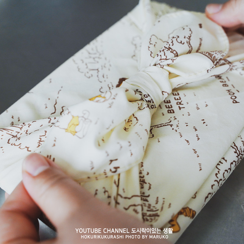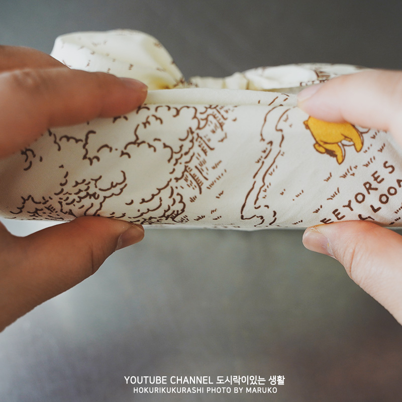 오늘은 평소보다 도시락이 슬림하니 남편 가방 속에 쏙- 들어가요. 물론 수프와 젓가락이 남아있지만, 수프통과 젓가락은 따로 작은 헝겊 가방에 넣어서 마찬가지로 가방에 넣었습니다. 오랜만에 꺼낸 도시락 보자기를 사용했어요. 사실 평소에 사용하는 마게왓빠보다 넓직하고 큰 편이라고 할 수 있는데 높이가 낮으므로 도시락 보자기 사이즈 걱정은 없었어요. 대부분 도시락 보자기 사이즈는 48~50 센티라면 넉넉하게 다양한 도시락 케이스를 넣을 수 있으니까요.(2단 말고 1단 도시락 추천)