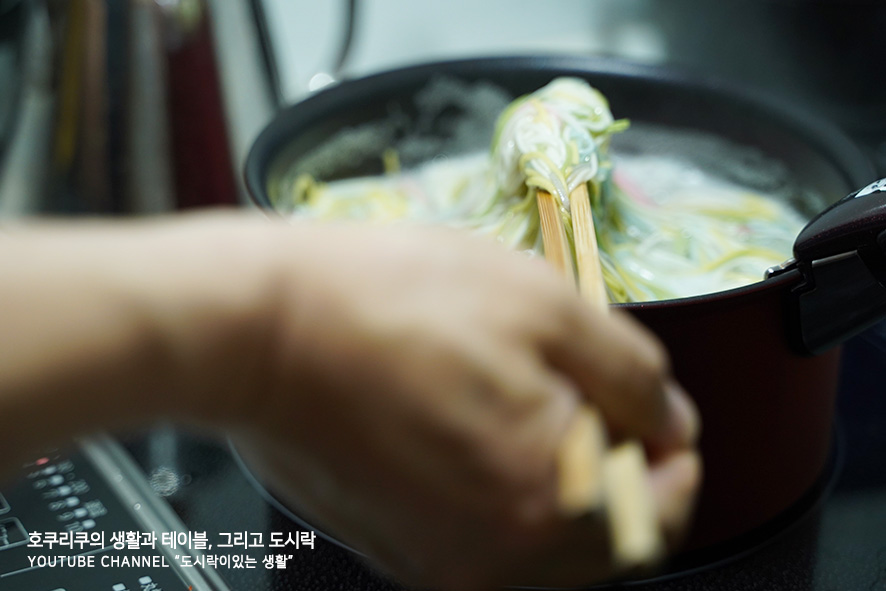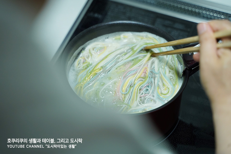 매년 판매하는 일곱가지 색상 소면(いろいろそうめん)을 또한번 구매해서 절반씩 사용, 대부분의 색깔을 섞어 물에 삶아주었어요. 2분정도를 삶고나서 찬물에 식히며 씻어줍니다. 면삶는것은 남편이 도와주었어요. (자세한 기록은 새로 업데이트된 유튜브 채널 영상을 확인해주세요/게시글 하단에 첨부하겠습니다/)