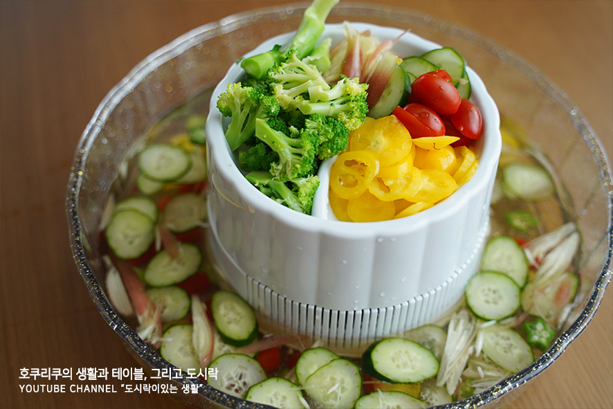 비장한 모습으로 준비하고 있는 남편. 삶은 면은 대부분 남편에게 몰아주었습니다. 남편은 정말 면요리를 좋아해요. 일본사람이라 그런지 소면, 소바, 우동 등등. 고맙게도 맛있게 잘 먹어주고있는 누카즈케 절임도 한켠에 쓱쓱- 잘라 접시에 올려놓아주었어요.