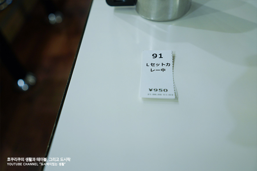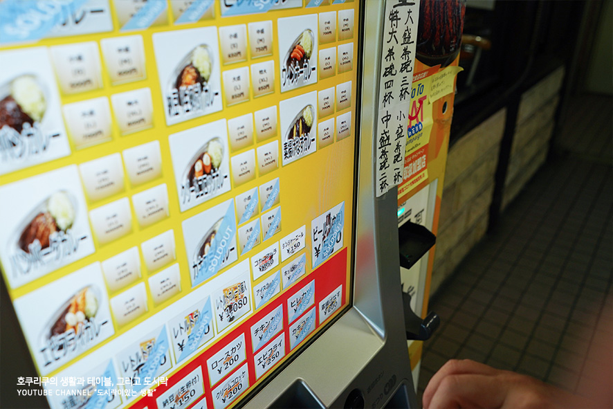바깥에 자동 판매기로 먹을 메뉴를 선택한 뒤, 티켓을 가지고 들어오면 됩니다. 카레의 사이즈는 기본적으로 소,중,대,곱배기(오오모리)로 나뉘구요 최소 500엔에서 최대 1,200엔~1,300엔 정도 가지고 계신다면 제공되는 물과 함께 배부르게 한끼 식사가 가능합니다.