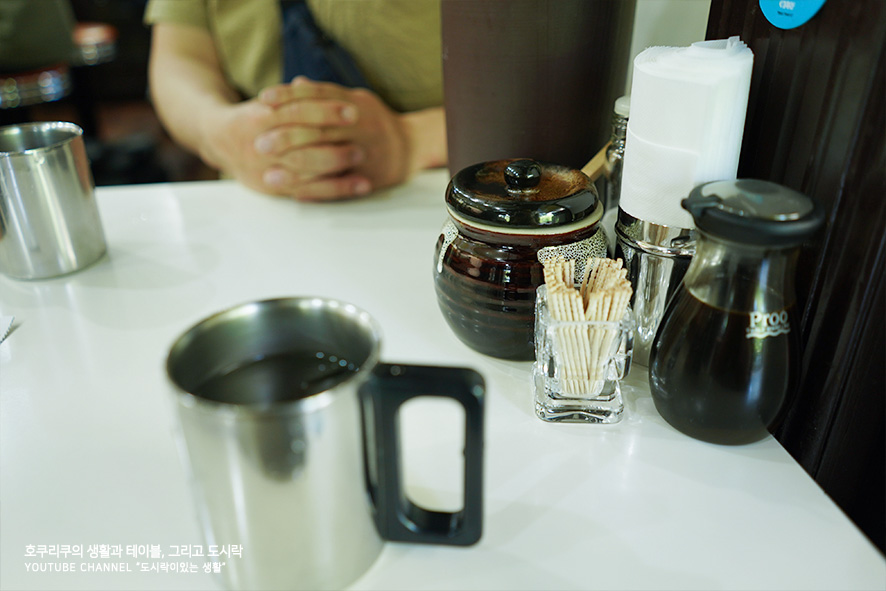들어가면 우측으로 8명 남칫 착석 가능한 카운터석이 각각 코로나 칸막이 설치로 마련되어있고, 좁은 통로를 두고 건물 유리벽쪽에는 2인석 테이블이 3개정도 놓여있습니다. 최대 2명씩정도만 앉을 수 있을 것 같습니다. 전체적으로 가게는 좁지만 사실 저는 가게의 사이즈를 따지는 성격은 아니기때문에 이런 아담한 가게들에 녹아있는 그곳만의 시간들, 정취 등을 좋아합니다.