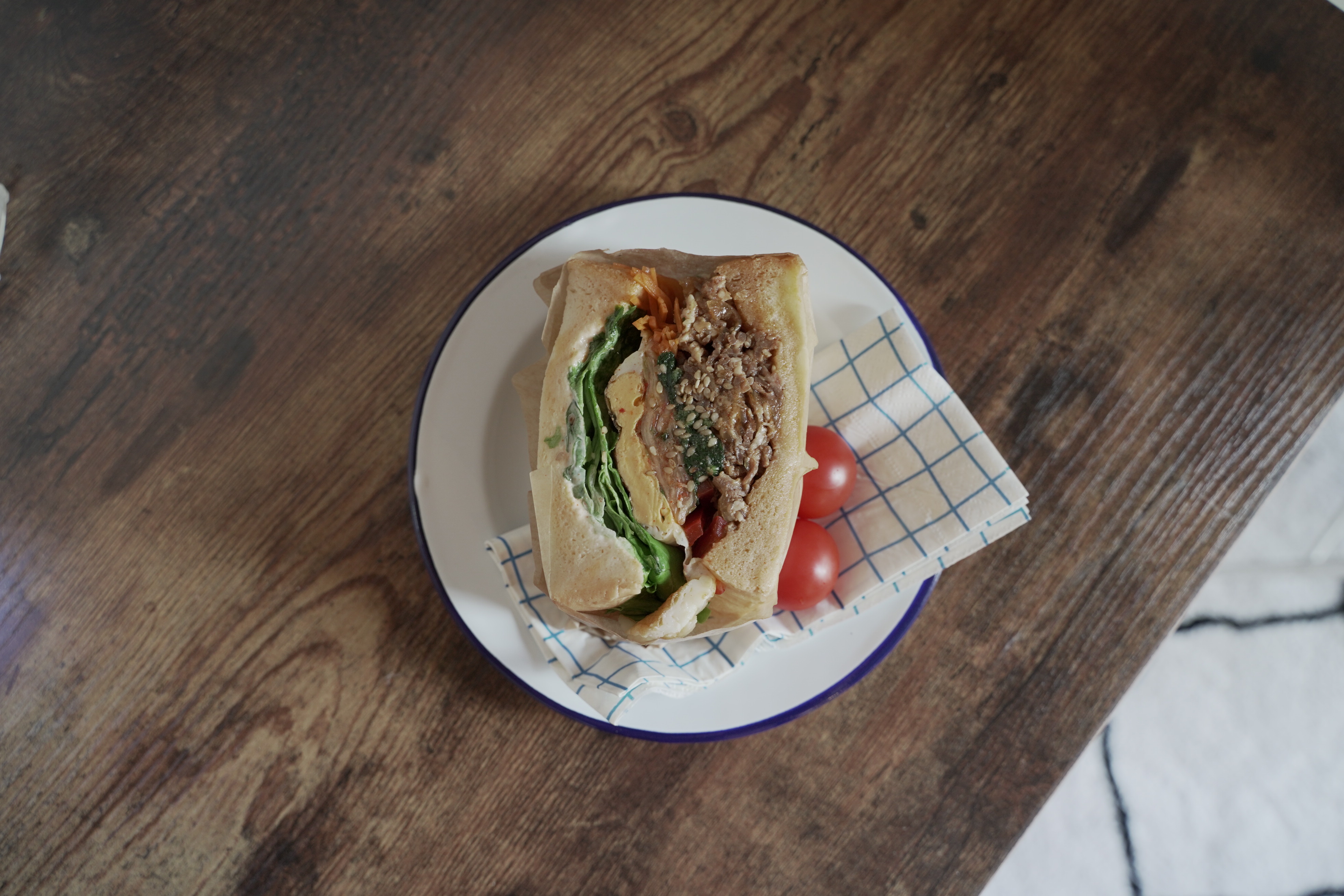 상추, 파프리카, 당근, 불고기, 김치, 계란, 이 들어가있었던 한국식 불고기 샌드.