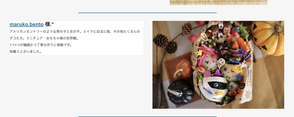 함께 콜라보를 진행한 뒤의 결과였기애, 뭔가 잘 봐주시거나 결과가 좋도록 힘써주셨다고는 절대 생각하지 않습니다. 정말 너무나 평소 지켜봐왔던 다른 일본 주부들의 작품들도 출품되고, 또 할로윈이라는 테마로 무엇을 만들어갈 수 있는가 라는 상상에서오는 설레임, 제가 생각하지 못했던 다양한 할로윈 디자인 도시락들을 보며 "와, 이런것도 만들수가 있구나" 하며 감탄하는 즐거움등등이