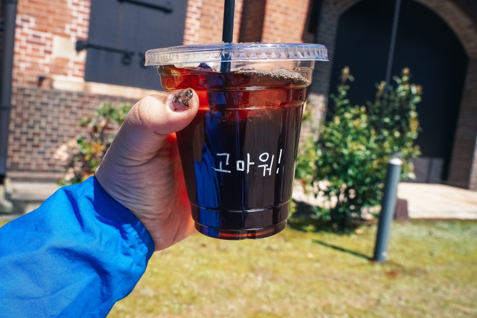 잠시 후 아내분도 오셨는데, 이렇게 귀여운 한글로 "고마워" 라는 글자가 써진 1회용컵에
