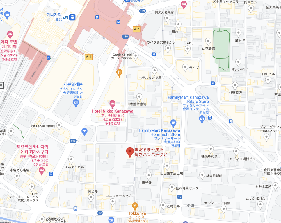 이곳은 가나자와 역 동쪽출구(츠즈미몬 등지고) 우측 건너편의 JAL호텔 주변에 위치하고 있고