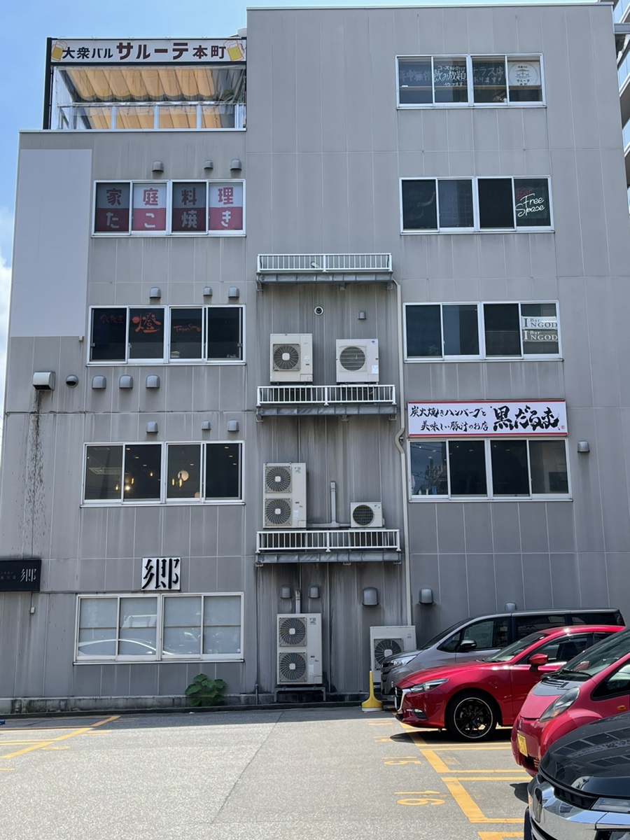 주차장에서 바라본 건물의 2층 한쪽 전체가 쿠로다루마 매장입니다.