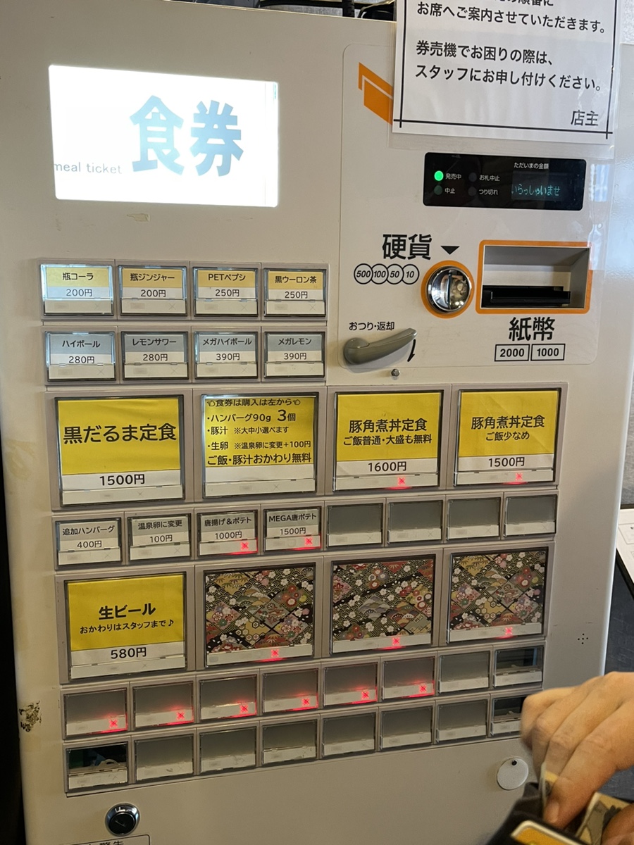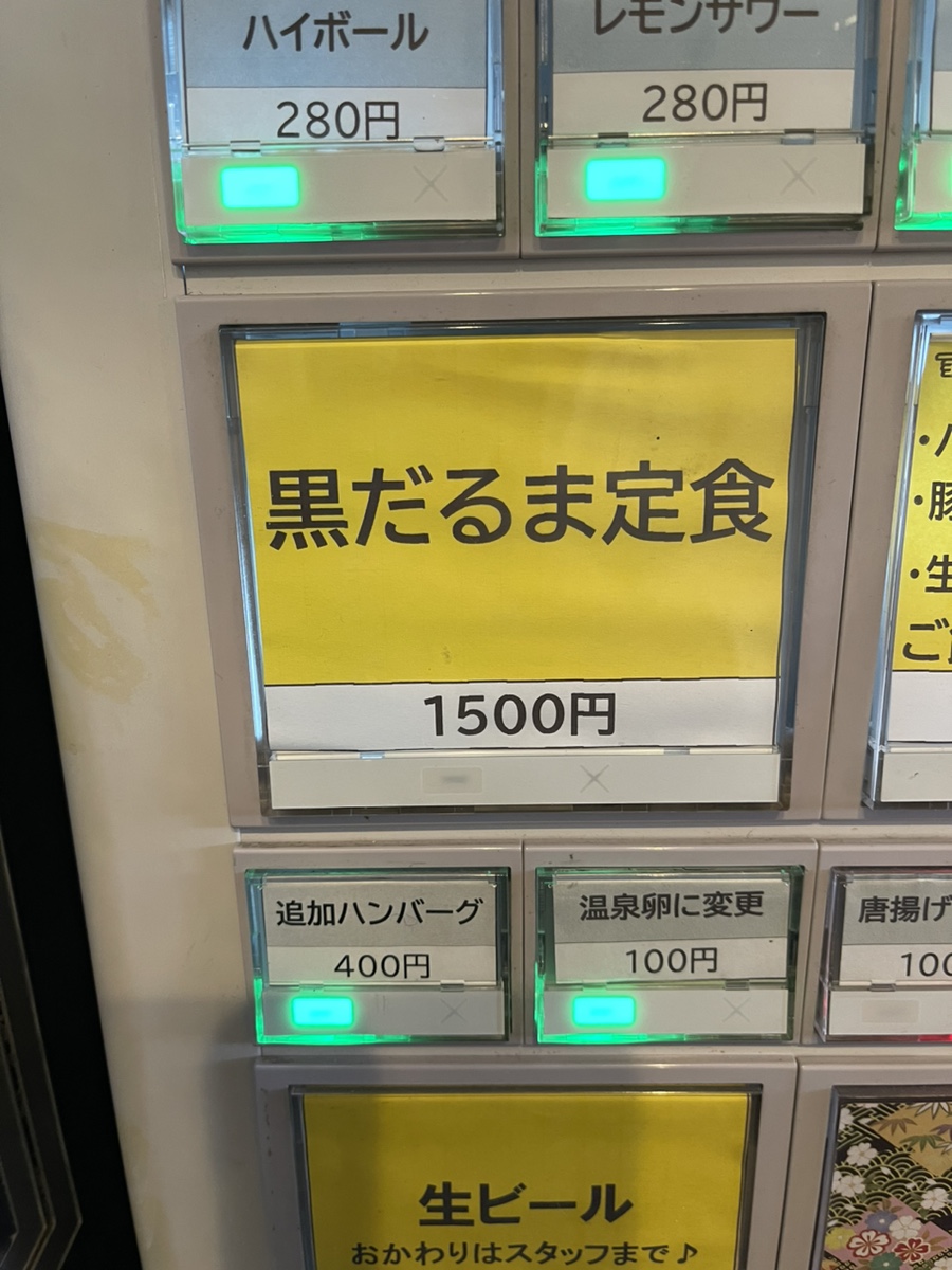 대부분의사람들이 가장 왼쪽 노란 버튼의 "쿠로다루마정식"(1500엔) 을 먹는다고해서