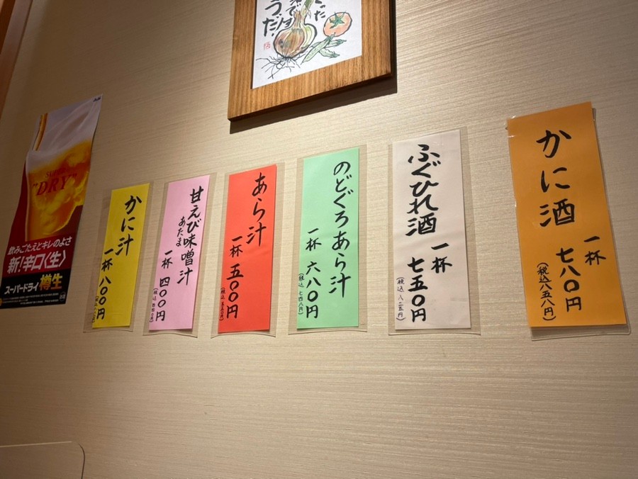 앉은 좌석 벽면에는 다양한 된장국, 그리고 후쿠 지느러미(?) 를 넣은 따뜻한 술 1잔 메뉴가 붙어있네요.