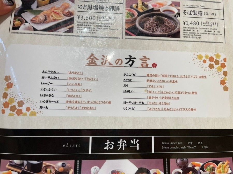 메뉴 중간에는 가나자와에서 사용하는 말, 표현도 팁으로 적혀있으니,