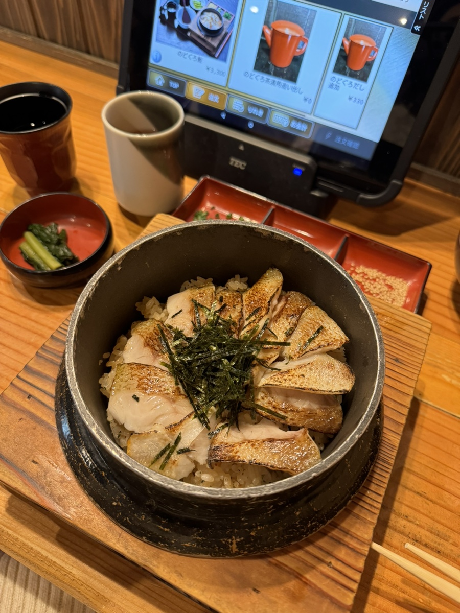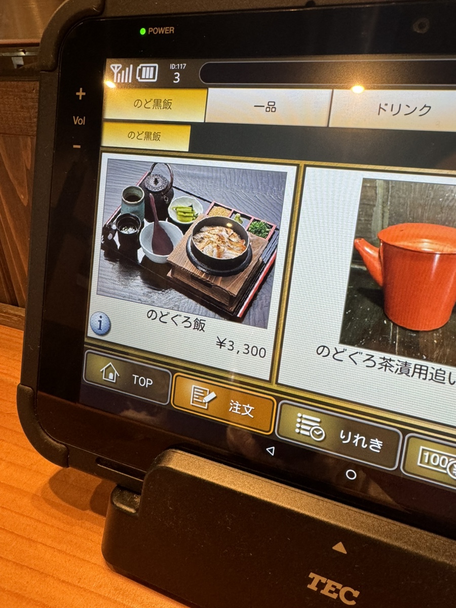 주문은 앞쪽 터치판넬로 주문해요. 다른거 보지 마시고, "のどぐろ飯”3,300엔 메뉴를 선택하시면 됩니다.
