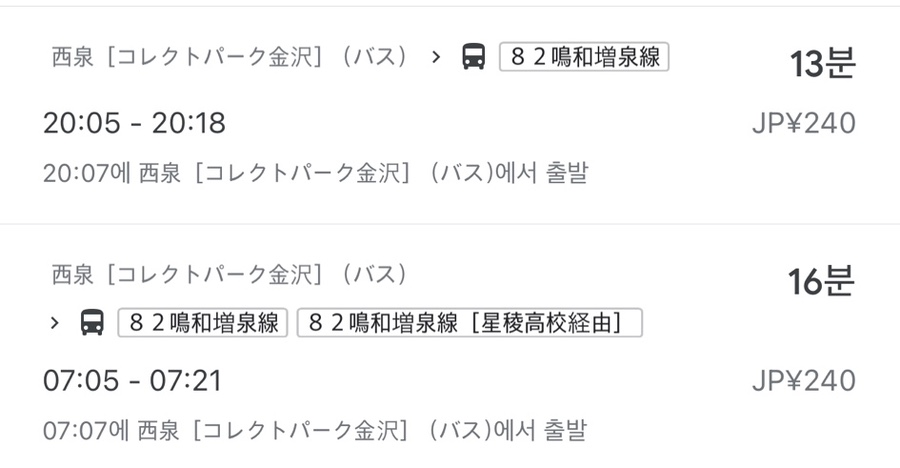 메가돈키에서 가나자와 역 방면으로 돌아가는 시간표.