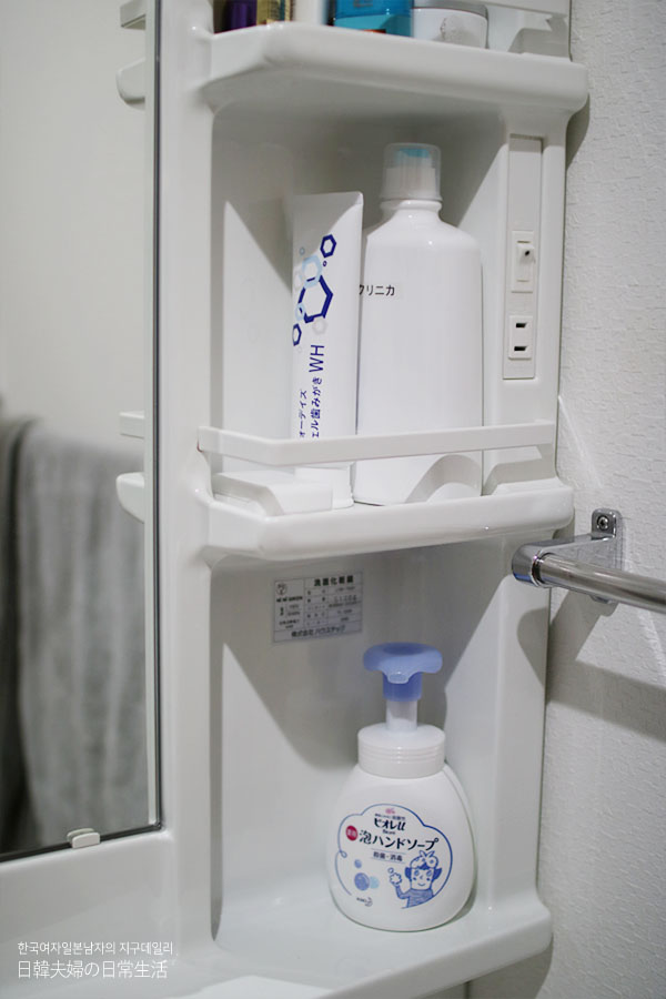 가장 잘 사용하는 세제 등을 넣어두고, 리필 여유분은 모두 세면대 하단의 수납장에 수납했습니다.