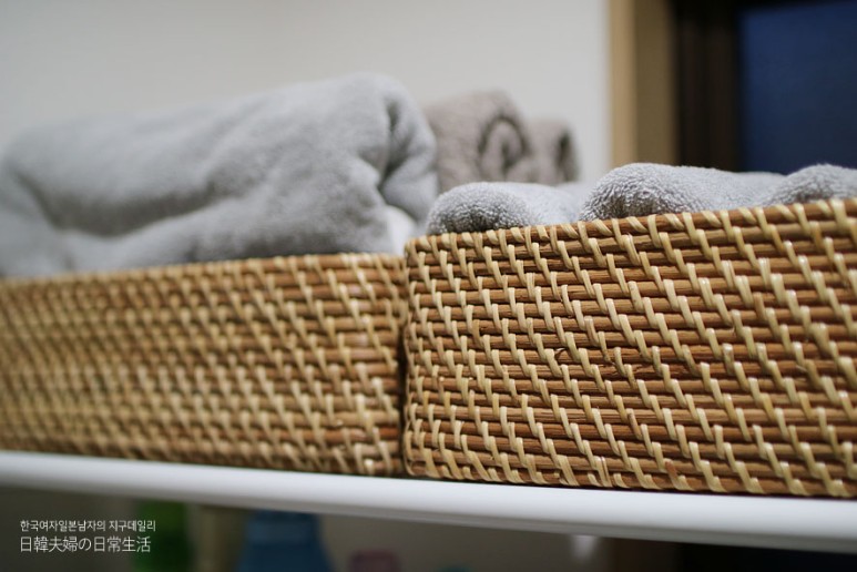 현재로써는 타올들과 세탁 세재들, 그리고 헤어용품 및 화장품 등과같은 하루에 한번 이상 자주 사용하는 것들을 손에 닿기 좋게 정리해봤습니다.