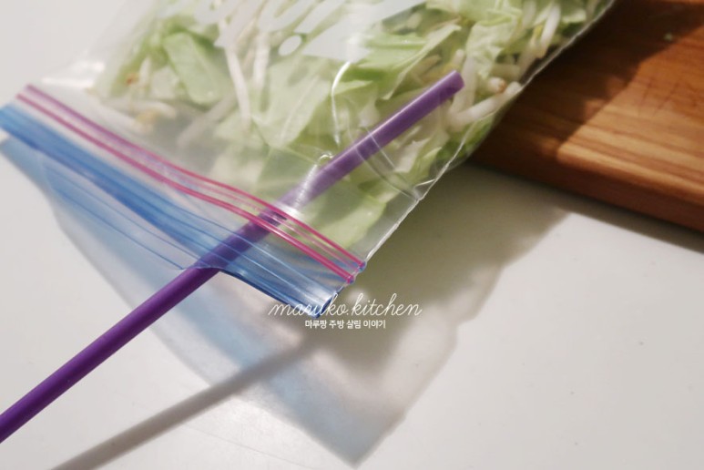 지퍼백 안에 야채를 모두 담고나서 일단 빨대가 하나 겨우 들어가있을 공간을 제외하고는 지퍼백을 모두 닫아요. 빨대를 지퍼백 정 중앙에 둔 상태에서 (빨대의 위치는 지퍼백의 제일 끝부분을 유지) 있는 힘껏 숨을 들이키며 빨대를 함께 서서히 지퍼백에서 빠져나오듯이 (계속빨아들이는것을 유지한채) 빼면서 빨대 두께 사이즈만큼만 벌어져있던 부분을 빨대가 빠져나옴과동시에 마져 재빠르게 닫아줍니다.