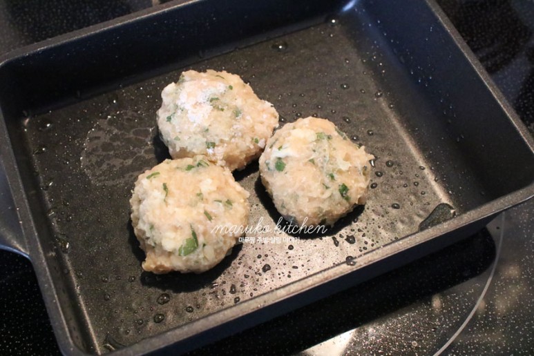 요녀석은 프라이팬에 구워줄때에도 방심하면 안되는것 같아요. 두깨가 꽤 있는완자여서 옆구리도 굴려주며 골고루 구워줬거든요. 확실히 두부를 넣으니, 적당한 포만감도 더해지고 무척 맛있어집니다. 아이들이 좋아할 것 같은 최고의 반찬이기도해요.