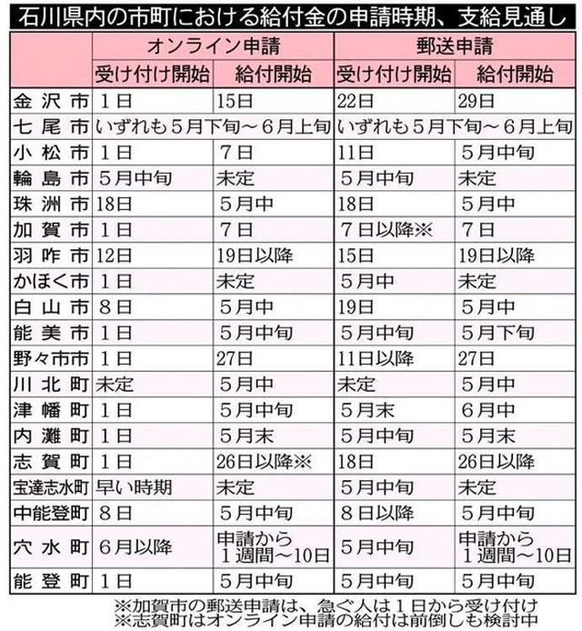 이시카와현 안에 있는 여러 지역마다 아주 조금씩의 차이는 있지만, 대부분 5월 1일부터 시행하거나 혹은 일주일 남짓한 기간의 차이를 두고 지원금을 신청할 수 있게 된 것인데요,