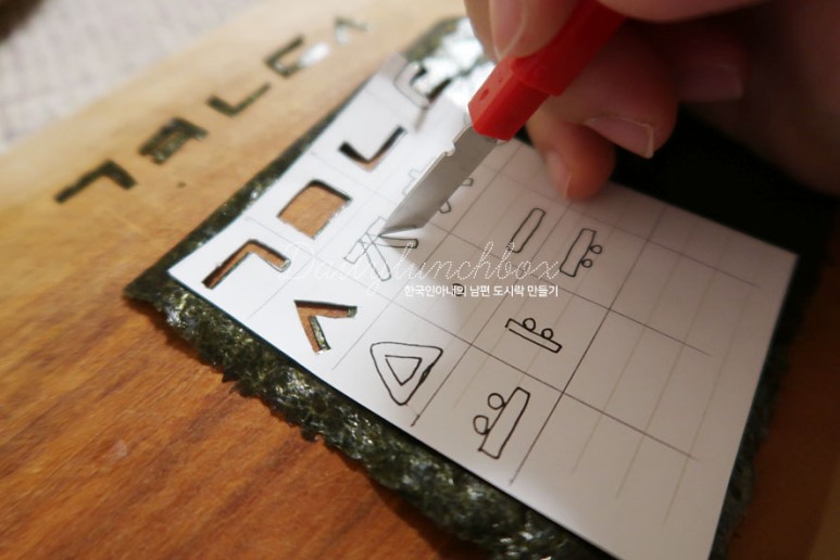 섬세하게 김을 조각조각 오려내서 치즈위에 얹혀 메세지 도시락이나 그림을 넣은 도시락을 만드는것에