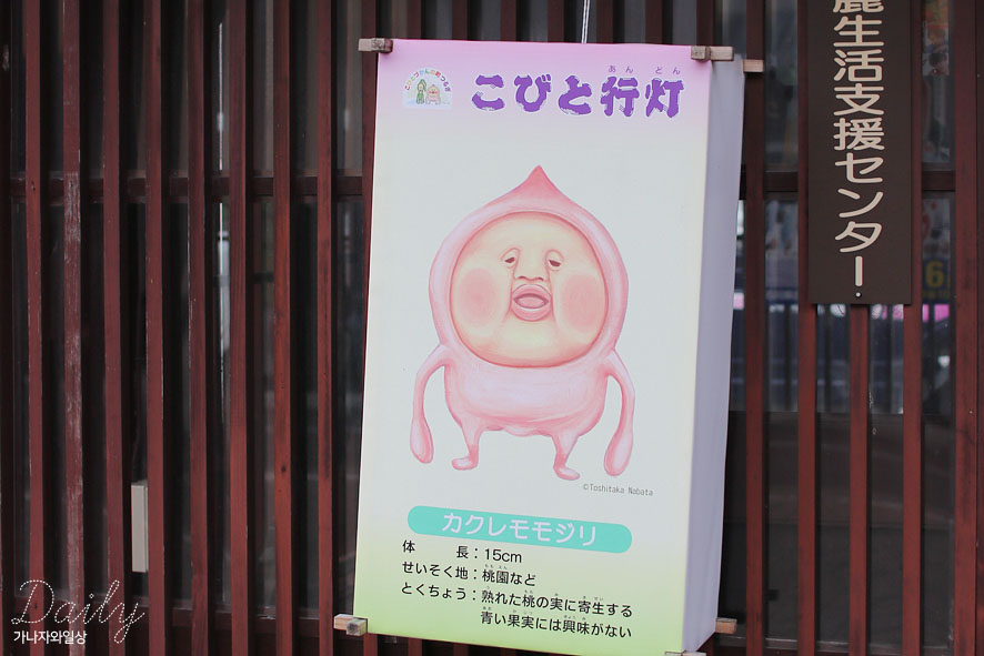 앞서 설명하기도했고, 예전에 카쿠레모모지리 캐릭터와 그 캐릭터 작가가 와가시상점 히로노와 함께 콜라보했던 와가시를 사러 다녀온 포스팅도 업데이트한적이 있는데요 카쿠레모모지리의 캐릭터 작가가 이쪽 하쿠산시 출신이라 이쪽 마을을 부흥하고자 하는 취지에서도, 아이들이 좋아할만한 캐릭터들(사실 어떻게보면 좀 섬뜩하기도)을 만들어 마치 여기저기 숲에서 살고있는 것마냥, 신장사이즈와 특징등을 기록해 여러가지 영상들을 만들기도하고 또 이렇게 하쿠산시를 돌아다니다보니 해당 캐릭터들을 소개하는 판넬도 볼수 있어서 무척 흥미로웠어요.