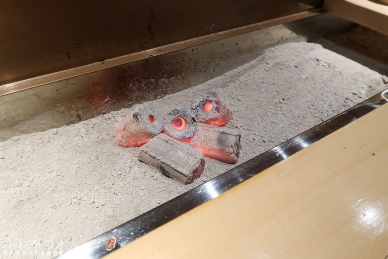 자리에 앉는다고 숯을 다 넣어주진 않아요. 주문하는 메뉴에 따라서 필요할 경우에만 준비해서 넣어주십니다 사장님께서 직접 숯을 넣어주셨고 저희는 처음에 회를 먼저 먹은뒤에 나중에 오더한 메뉴가 구워먹는 메뉴였기때문에 숯 구경은 나중에나 할 수 있었어요.