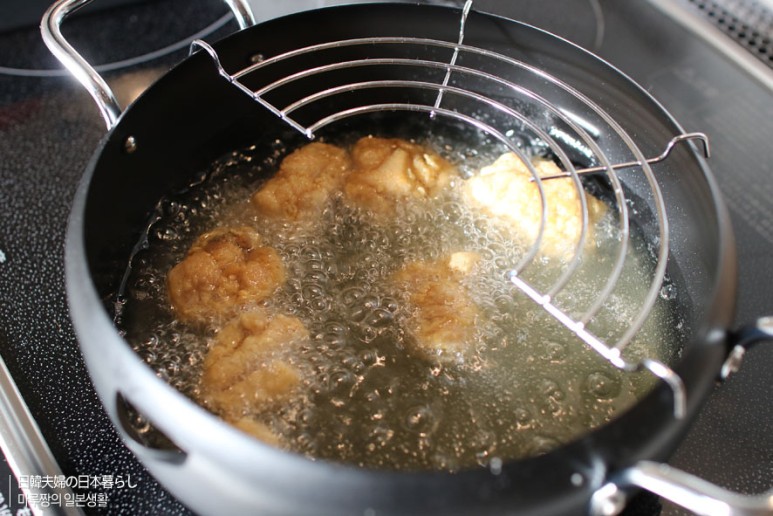 요리용 나무 젓가락으로 하나하나 뒤집어가며 골고루 튀겨지도록 나름 최선을 다하는 시간이라고 생각됩니다.