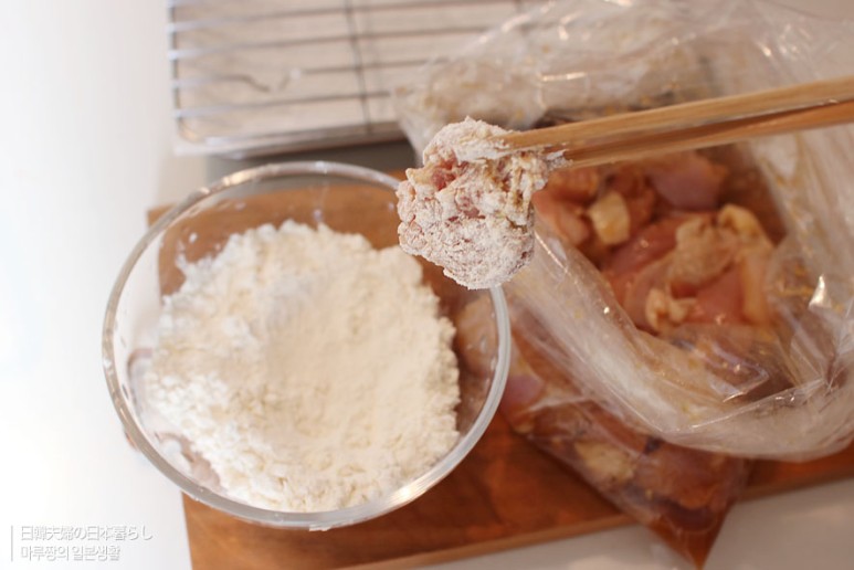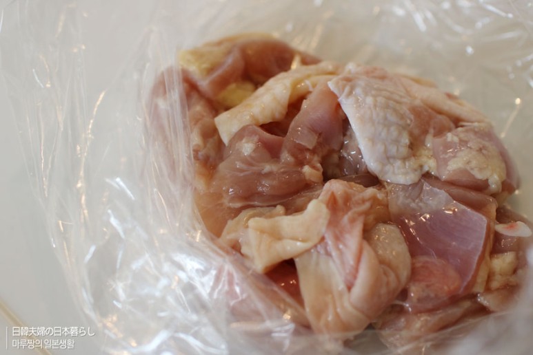 저는 이번 포스팅 테마인 "도시락한입크기 가라아게" 에 맞춰 닭고기를 적어도 2분의 1로 더 자른 상태라 고기들 상태가