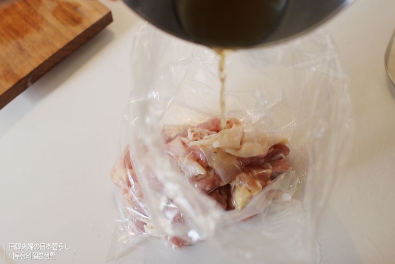 가라아게 만들기 작업을 시행하면, 설탕물에 넣기 전과는 현저히 촉촉하고 수분이 머금은 닭고기로 변한 모습을 볼 수 있습니다.